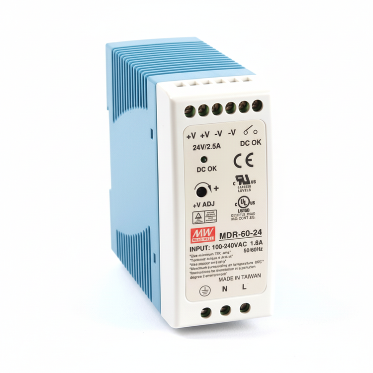 منبع تغذیه مین ول MDR-60-24 یک پاور سوئیچینگ ریلی با توان 60 وات و خروجی ثابت 24V DC / 2.5A است. این منبع تغذیه با طراحی باریک، قابلیت نصب روی ریل DIN و راندمان بالا، انتخابی مطمئن برای تغذیه تجهیزات صنعتی و اتوماسیون است.